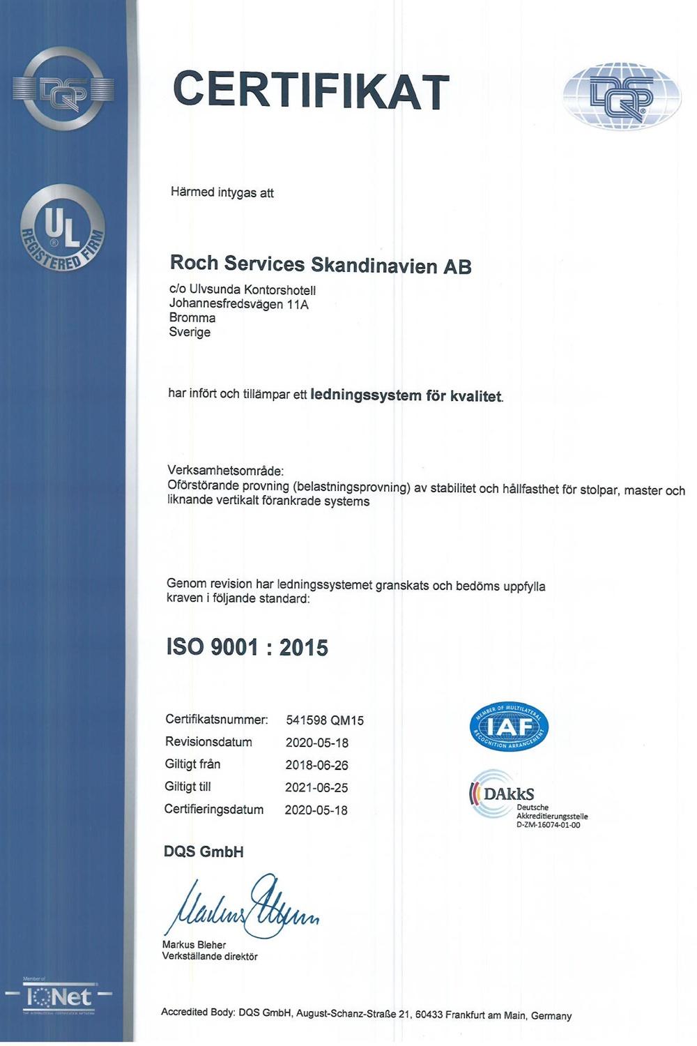 Roch Services Skand. AB är likväl DIN EN ISO 9001 certifierat: